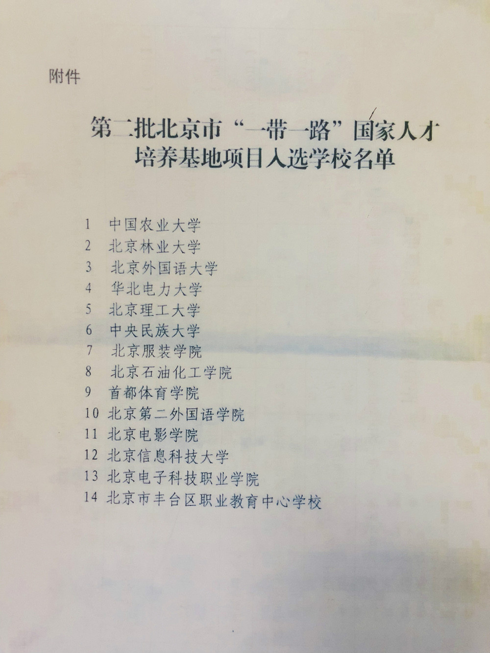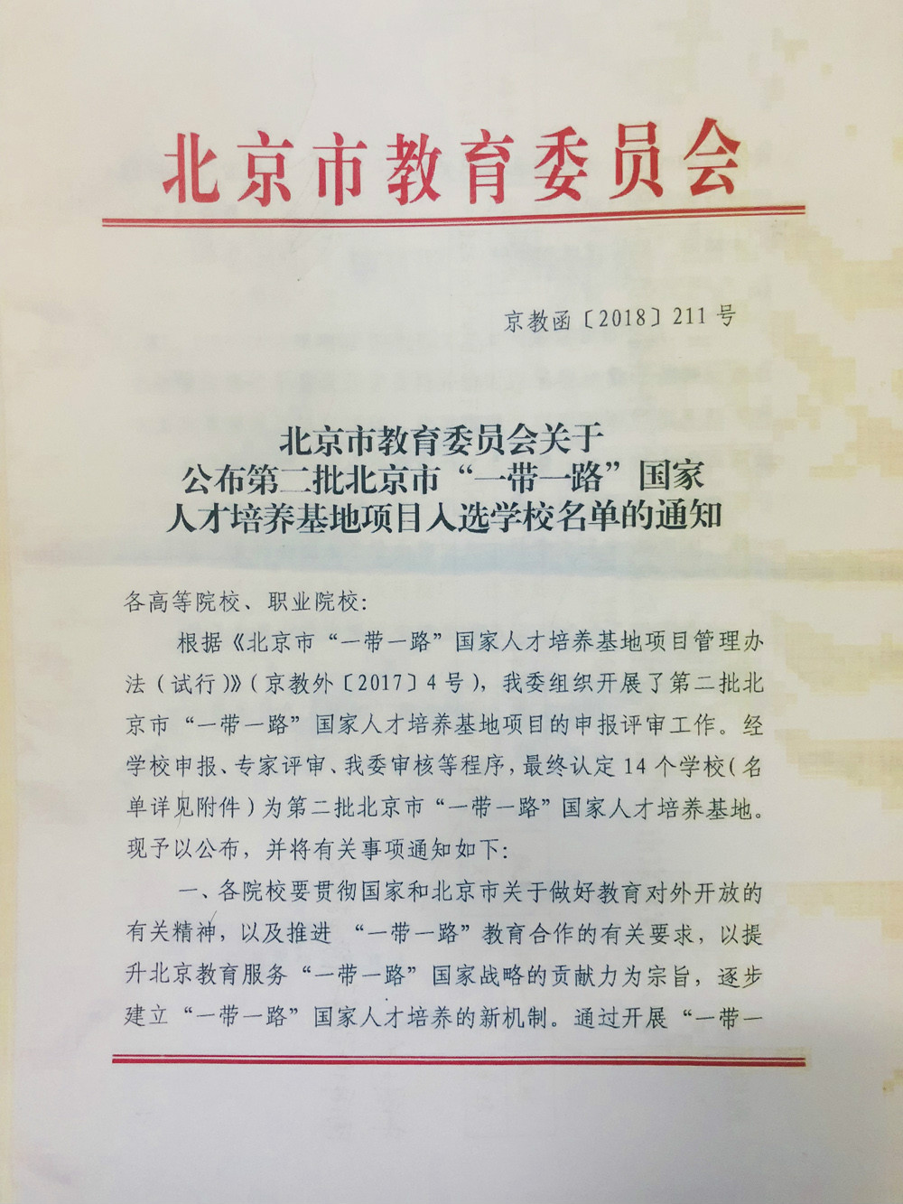 经我校申报、专家评审、北京市教育委员会审核等程序,我校最终入选第二批北京市“一带一路”国家人才培养基地项目。